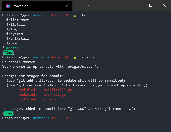 - vcsStatus 출력은 Posh-git 이 import 되었는지를 확인하여, Write-VcsStatus 를 이용하여 출력을 하였다.