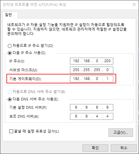인터넷을 사용하려면 게이트웨이를 통해서 외부로 나가야 한다. Windows 에서 아래와 같이 게이트웨이 IP를 설정하는 이유이다. (아래 그림으로 본다면) 사무실의 내 컴퓨터가 192.168.0.203 이라는 Local IP를 이용하는데 외부와 연결이 되는 게이트웨이의 정보를 명시해줘야 하는 것이다.