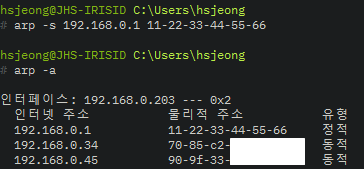 이 명령으로 특정 IP를 특정 MAC 으로 "정적" 할당을 할 수 있다. AP가 할당해준걸 쓰지 않고 이걸로 무조건 쓰겠다고 하는 것이다.