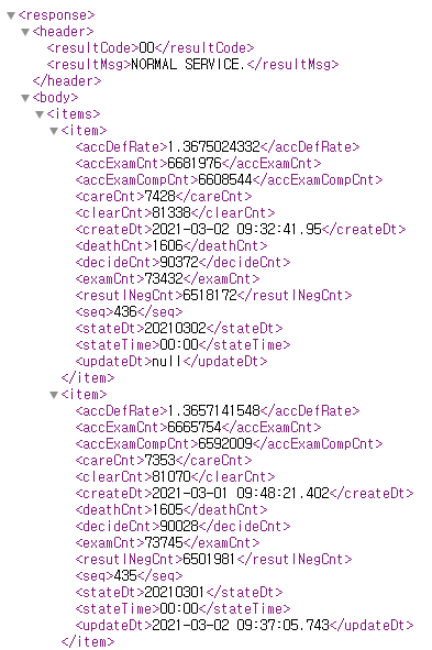 지난번 포스팅대로 오픈API 요청을 보내면 아래와 같은 response를 받는다.