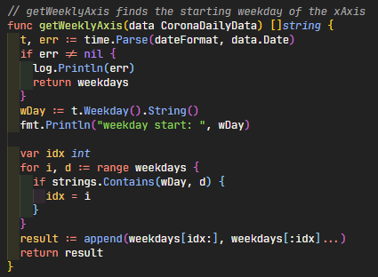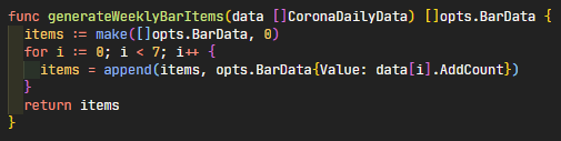 generateWeeklyBarItems()는 우리가 생성해낸 data 를 기반으로 bar에서 쓸 수 있는 슬라이스를 리턴하게 해주는 함수이다.