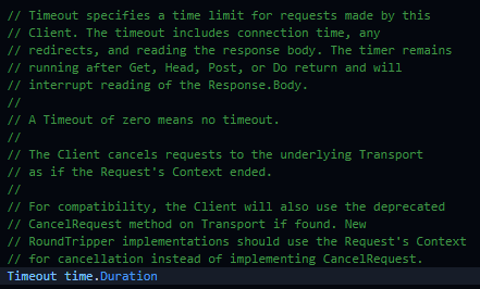 default http client는 Timeout 필드가 설정되어 있지 않으며 zero value 일때에 무한히 기다리게 된다.