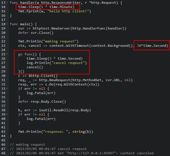 2) 30초 뒤에 timeout이 걸리는 request를 고루틴을 통해 보낸 다음