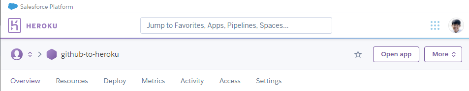 성공후 Heroku로 가보면 github-to-heroku app 이 생성되어 있는 것이 보인다.