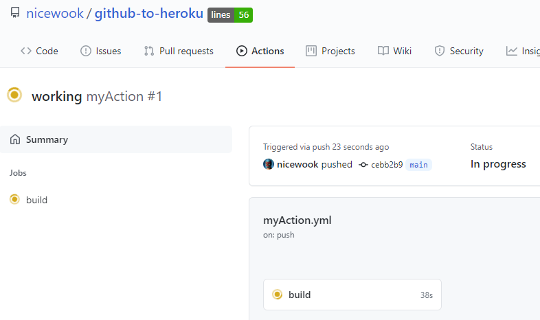 이제 git push 만 해주면 Heroku에 app이 생성되고 자동으로 실행된다. GitHub repo로 가서 Actions 탭으로 가보면 진행사항을 확인할 수 있다.