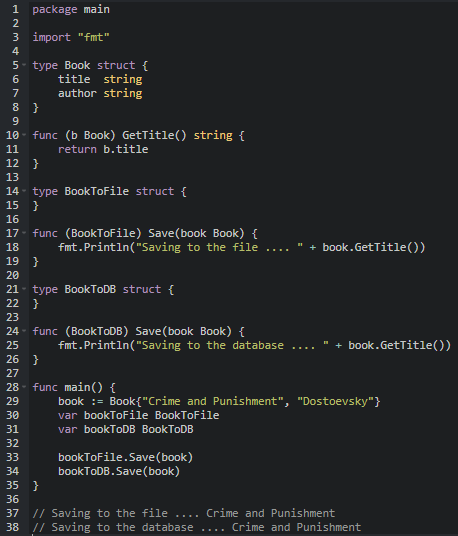 - BookToFile 이나 BookToDB 구조체의 Save() 메서드를 변경한다 하여도 Book 구조체나 구조체의 GetTitle() 메서드는 변경할 필요가 없다