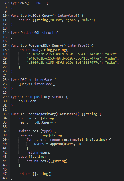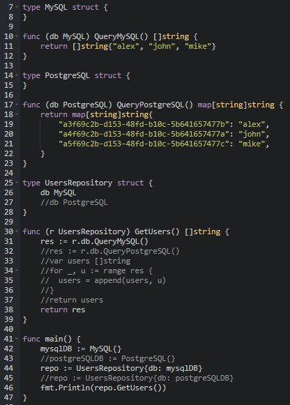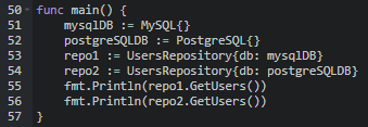 main() 함수를 보면 UserRepository 구조체는 다른 두 구조체 인스턴스인 mysqlDB와 postgreSQLDB 둘다 db 필드에 받을 수 있다. 둘 다 DBConn을 만족하기 때문이다.
