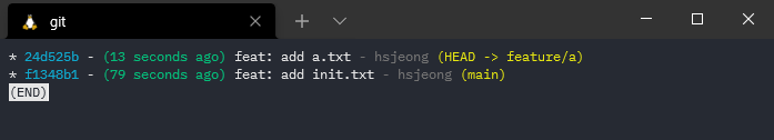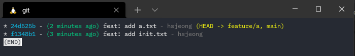 git log를 통해 main branch에 feature branch를 mege하고, 다시 feature/a branch를 checkout 한 것을 확인할 수 있다.