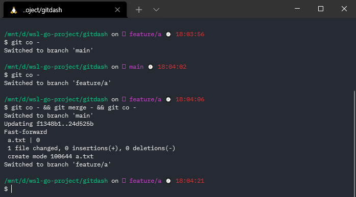 즉, 직전의 branch인 main 을 checkout 한다음에, 직전의 branch가 된 feature/a를 merge 해주고, 다시 feature/a를 checkout 해주는 것이다.