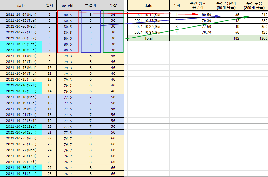매일의 몸무게보다는 주간 평균 몸무게의 추이를 보는 것이 좀더 정확하겠다 싶었고