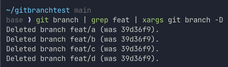 $ git branch | grep feat | xargs git branch -D