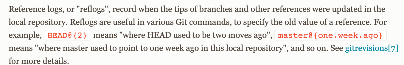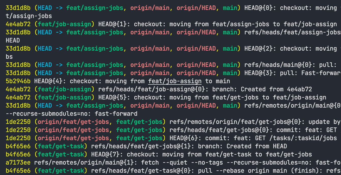 reflog 는 local repository에서의 git 작업의 기록이라고 보면 되겠다. 각종 명령에서 특정 지점을 명시할 때에 사용할 수 있다.