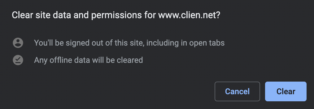 여기서 원하는 사이트를 선택하여 삭제를 하면 된다. 사이트를 찾기 어렵다면 위 검색창을 이용한다. 여기서는 clien.net 의 쿠키와 데이터를 삭제해본다.
