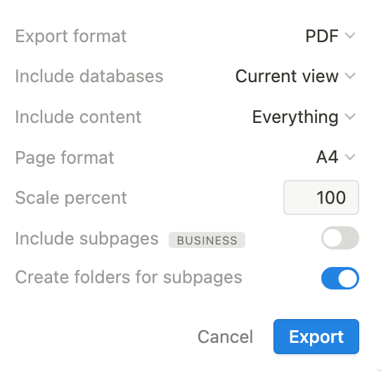 노션 문서를 PDF로 내보내는 것은 간단하다. 문서 우상단의 “점 세개”를 클릭해서 Export를 선택하면 나오는 팝업창에서 PDF만 선택한 다음 내보내면 된다. 글이 너무 크게 느껴지면 Scale percent를 70~80정도로 조절하면 좋았다.