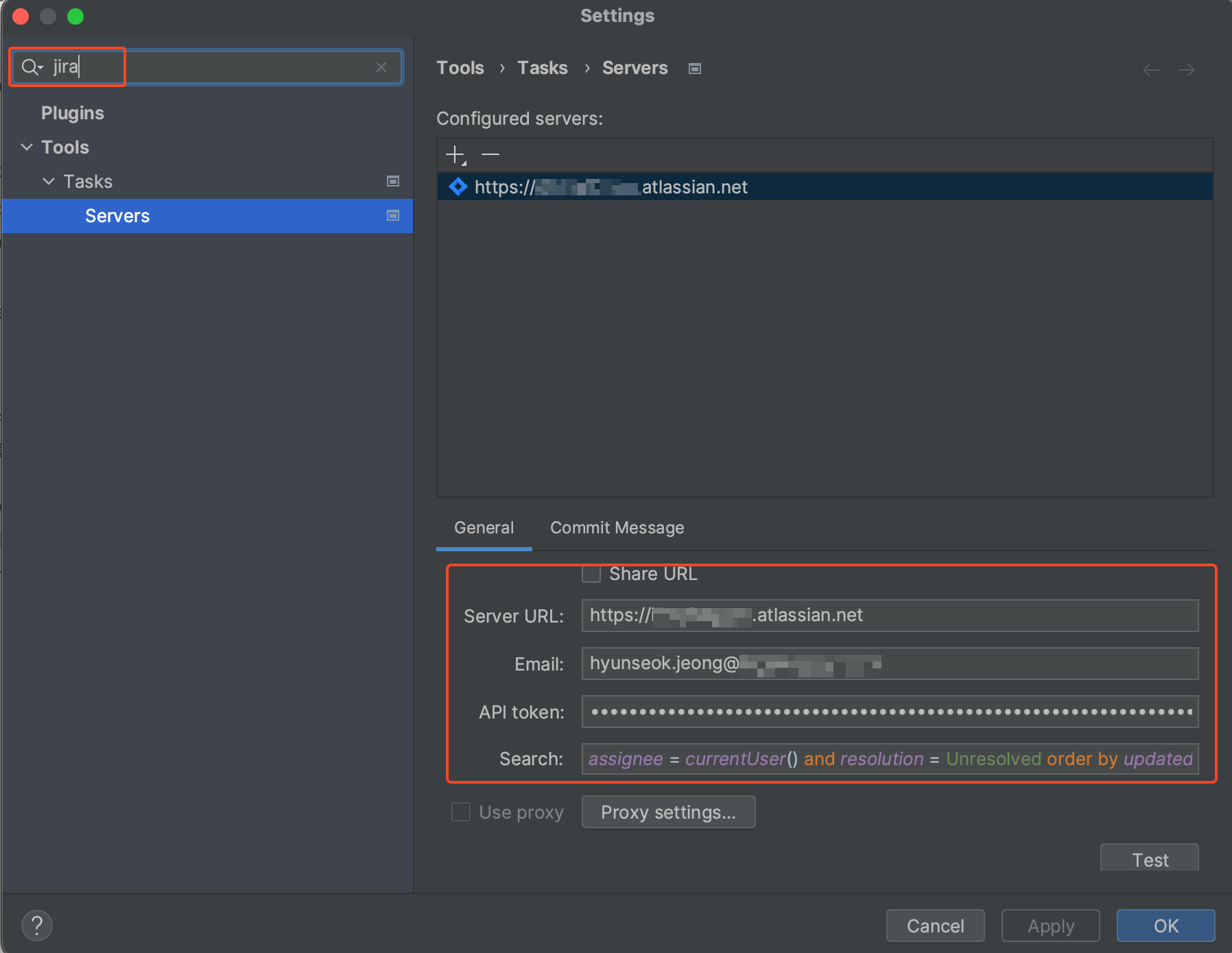 - 왼쪽부터 보면 Settings에서 Jira로 검색하면 Tools >> Tasks >> Servers가 나온다.