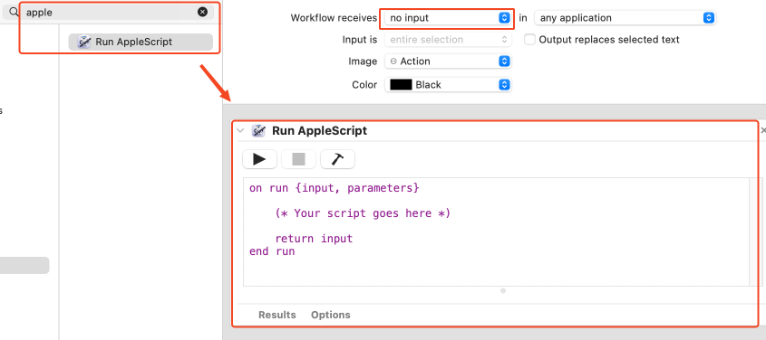 2. Workflow receives는 no input 을 선택하고, Run AppleScript를 검색해서 가운데로 끌어옮긴다. 그러면 가운데에 기본 AppleScript가 생성된 창이 나온다.