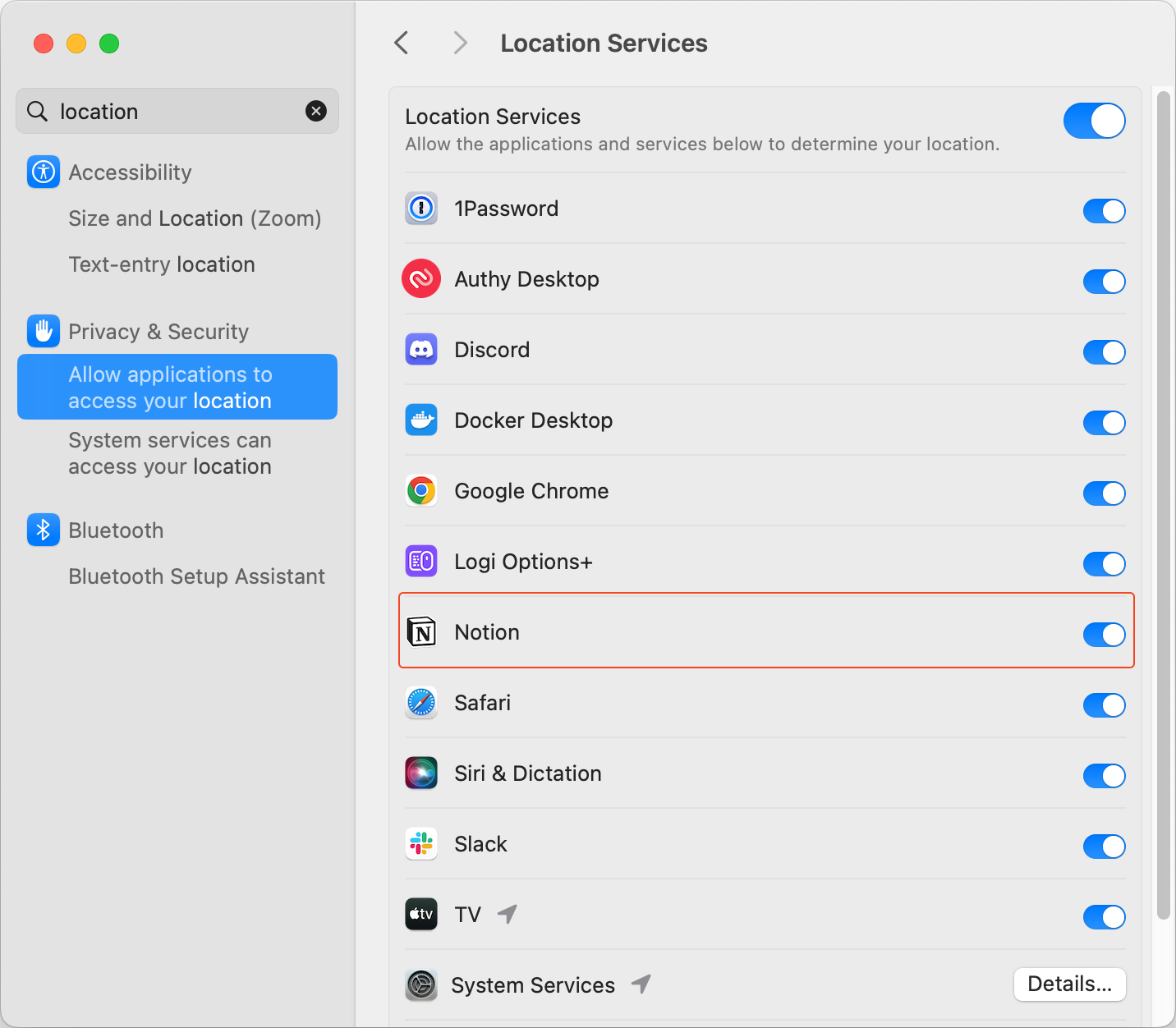 MacOS >> System Settings 에서 location으로 검색하면 Privacy & Security >> Allow applications to access your location 항목이 보인다. 여기에서 Notion 앱을 enable 해주기만 하면 된다.