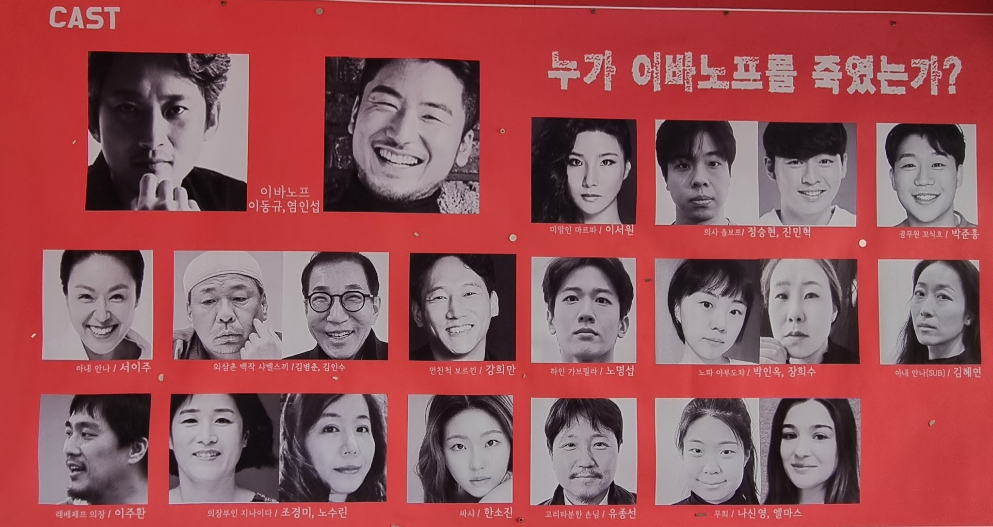 더블 캐스팅에서 이바노프 이동규님, 아내 안나 서이주님, 의사 진민혁님, 외삼촌 백작 사벨스끼 김병춘님, 노파 아부도챠 박인옥님, 의장부인 지나이다 노수린님, 무희 엘마스님으로 보았다.