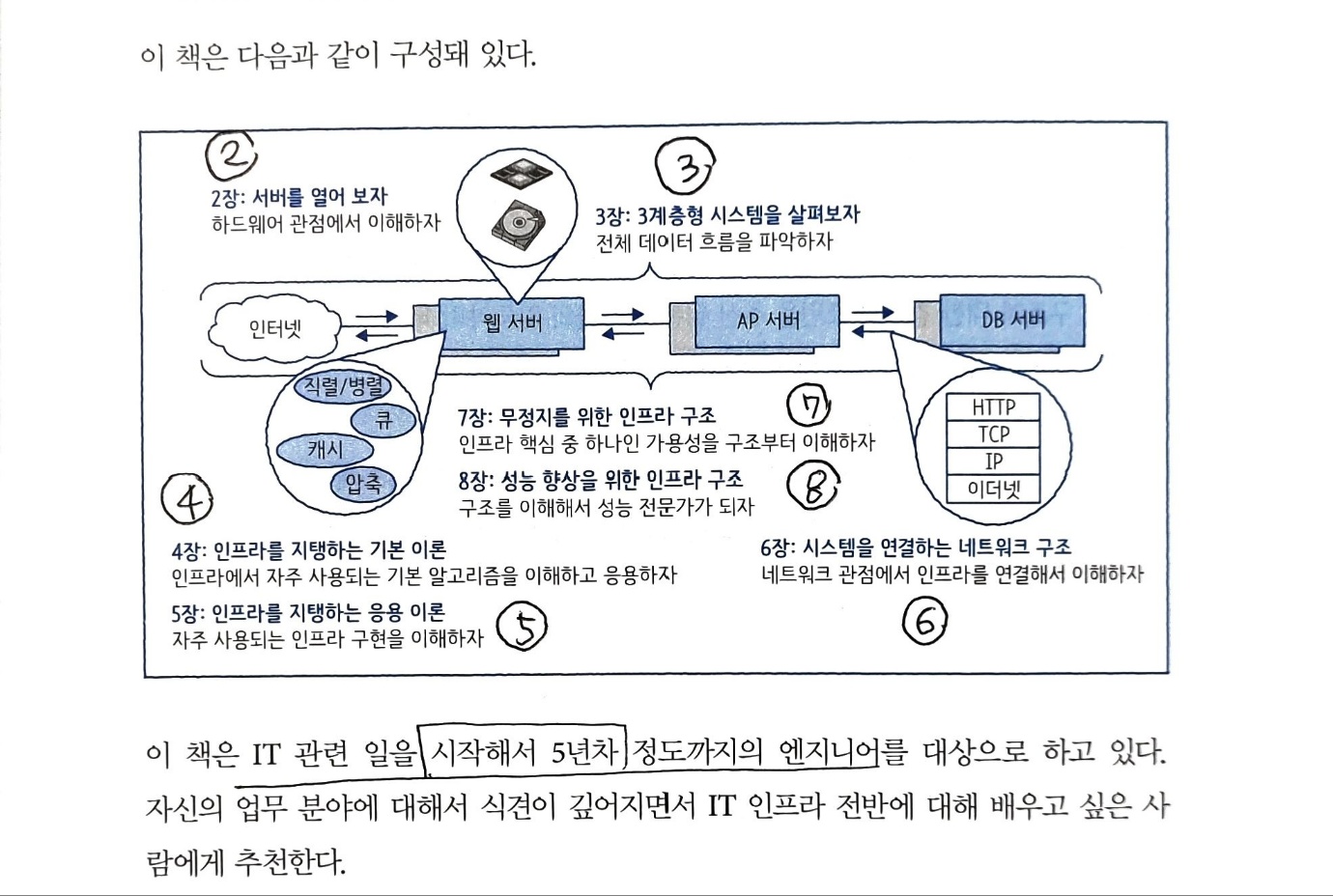 중간 쯤 읽을 때까지의 감상은 일본 특유의 꼼꼼하고 친절한, 초급자를 위한 책이라는 느낌이었다. 인프라와 그 아키텍처 전반을 훑어보고, 물리적인 측면에서 서버 면면을 챙겨본다. 그리고 기본이 되는 3계층형 시스템을 소개해준다. 그런 다음에, 인프라의 측면에서 챙겨보아야 할 컴퓨터 이론을 기본적인 항목에서부터, 나아가 좀더 챙겨보아야할 부분까지 이야기한다.
