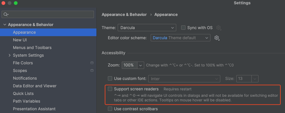 그런데 Support screen readers 옵션을 제거하고 Apply, Ok 후 IntelliJ 를 재시작 했음에도 저 설정이 계속 켜져 있었다.