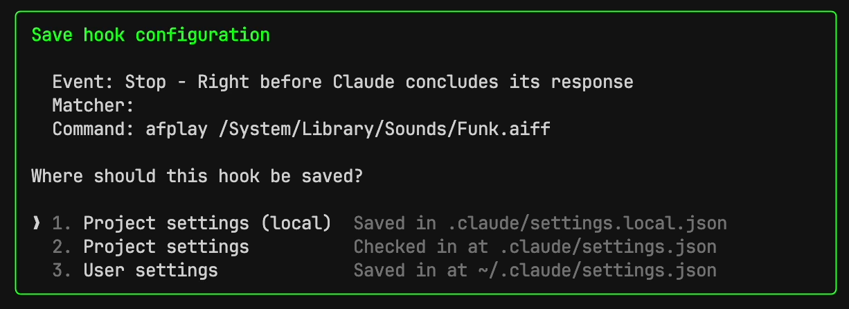 hook 을 저장할 위치는 user, project, project local(commit 되지 않는다)로 설정 할 수 있다. user로 설정하여 이 컴퓨터에서 Cluade Code 사용시에는 모든 경우에 적용되도록 하였다.