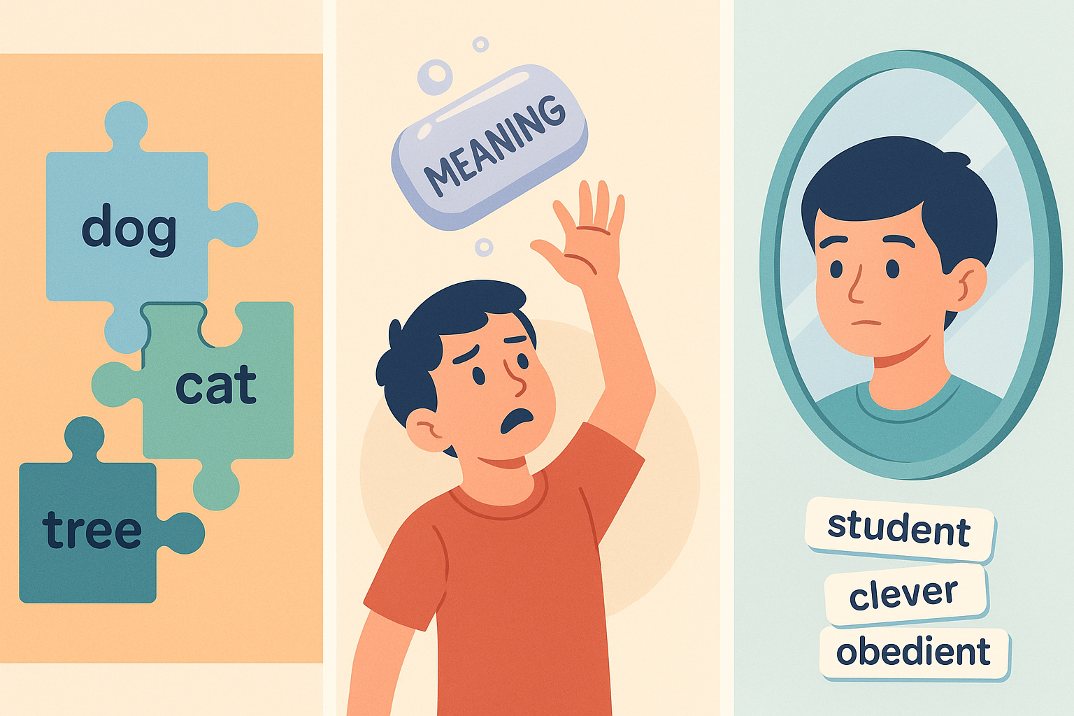 - 의미의 무한 연쇄: "사랑"이라는 단어를 설명하려고 하면, "좋아하는 마음", "배려", "설렘" 등등 또 다른 단어들로 설명해야 한다. 끝이 없다! 뜻이 미뤄진다.