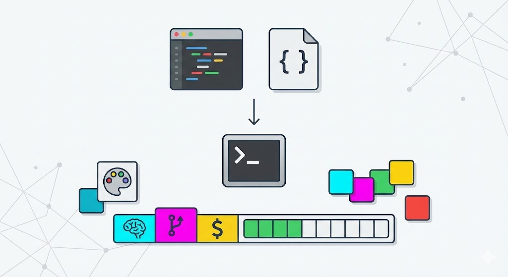 (실제 터미널에서는 각 요소가 지정된 색상으로 표시되고, 프로그레스 바 색상이 사용량에 따라 변한다.)