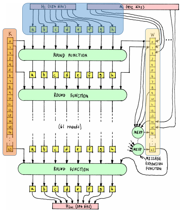 → H, K, W 들을 64번 Round Function 에 먹여서 H' 를 만들어낸다.